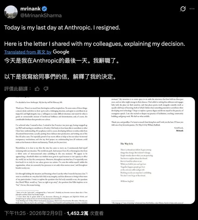 Mrinank Sharma在公开信中表示,他由衷感谢公司给予的宝贵经历以及对AI安全领域作出的贡献。然而面对日益加剧的经济压力,公司的某些决策已经难以契合他个人的价值理念。