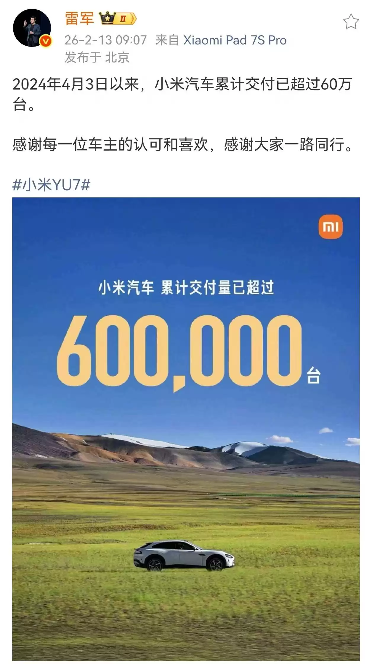 雷军宣布小米汽车交付破60万台,新一代SU7四月即将上市