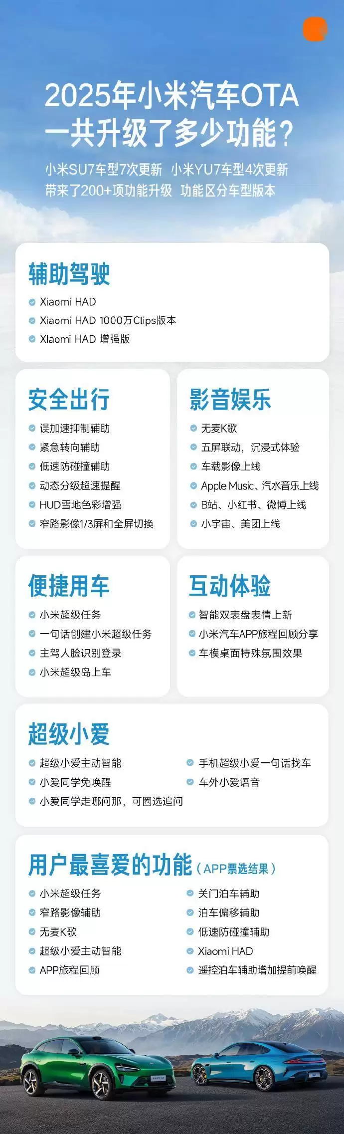 小米汽车近期详细公布了旗下车型的功能更新数据。进入2025年,小米SU7已完成累计7次系统升级,小米YU7则进行了4次迭代更新,两款车型合计新增功能超过200项,涵盖辅助驾驶、安全出行、智能交互等多个方面。