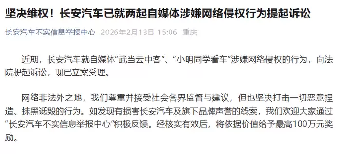 长安汽车近日通过官方渠道发布声明,已就部分自媒体账号涉嫌发布不实信息、损害企业名誉权的行为,向司法机关提起诉讼。此次被起诉的账号包括“武当云中客”和“小明同学看车”,相关案件已获法院正式立案受理。长安汽车表示,此举旨在维护自身合法权益,同时警示其他网络主体遵守法律法规,共同营造健康的网络环境。