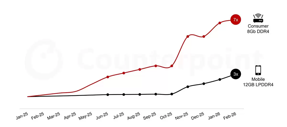 随着AI服务器领域需求的井喷式增长,全球存储芯片市场在过去一年里经历了前所未有的价格暴涨。数据显示,DRAM内存和NAND闪存的整体价格涨幅均突破600%。尽管智能手机和个人电脑曾被视为这场缺货危机中最先"受灾"的终端产品,但如今看来,这场冲击正加速向更广泛的消费电子领域蔓延——路由器等网络设备正成为新的重灾区。