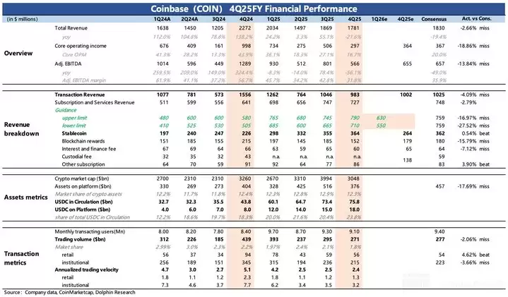 (下图中"4Q25e"这一列为Coinbase在财报公开披露前一天的机构预期)