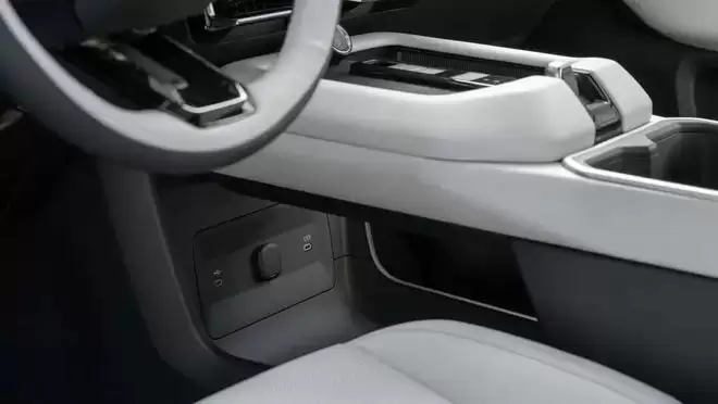 换挡机构并未采用当前新能源车流行的电子怀挡设计,而是布置在T型区域,电子挡杆体积小巧精致,合理的空间规划也预留出非常宽裕的储物空间。