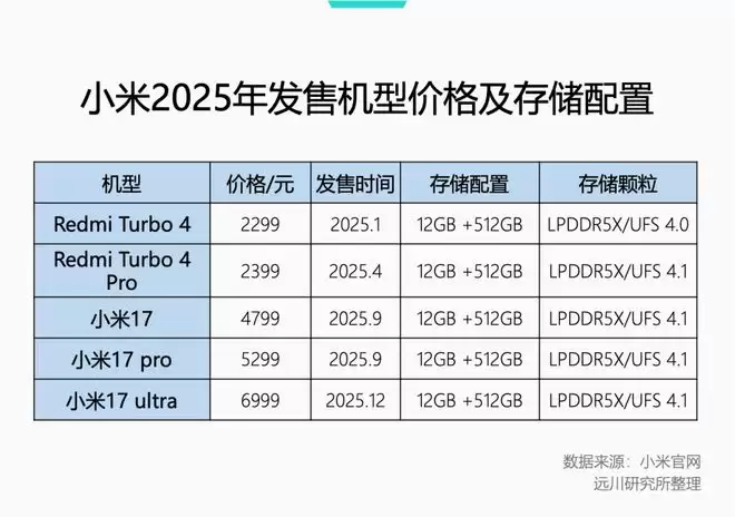 小米去年10月推出的Redmi K90系列新款,标准版较上一代上涨300元,其中12GB+256GB规格和12GB+512GB两种存储规格之间的价差达到600元。