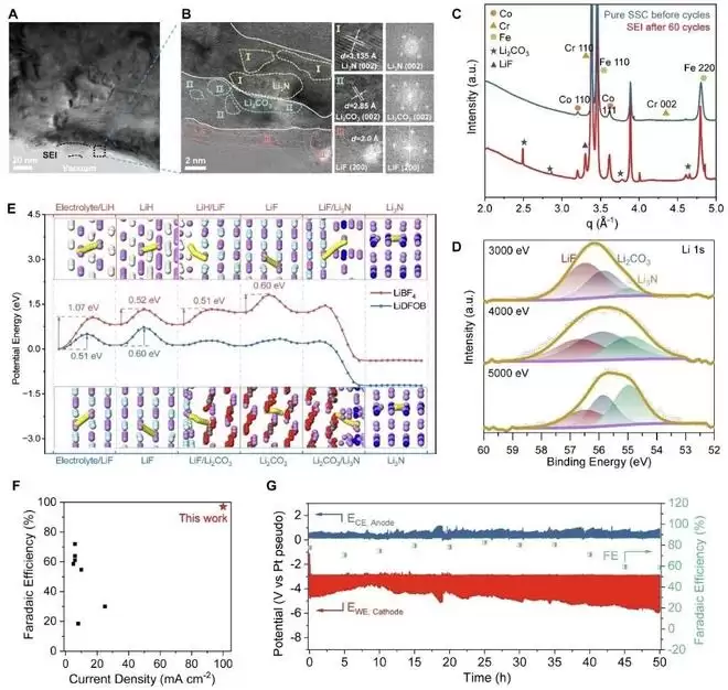 传统哈伯-博施法合成氨工艺需在高温高压环境下进行,且依赖化石能源,导致碳排放量居高不下。锂介导电化学还原制氨作为绿色替代方案,却长期受限于电极表面固体电解质界面(SEI)的离子传导性能不佳、高电流条件下易失效等瓶颈问题,致使氨分电流密度长期徘徊在8mA cm⁻²以下,高压间歇电解能效也仅为3%。