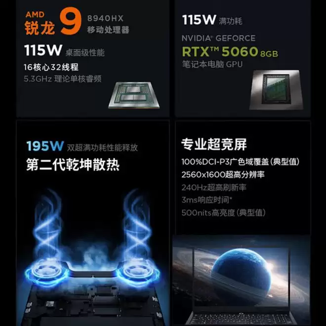 配备16英寸2.5K护眼电竞屏,240Hz高刷新率搭配500nit峰值亮度,画面清晰度与流畅度兼具,同时搭载ACR抗反光技术,可有效减少环境光线反射,即便在强光环境下玩游戏,屏幕画面也能保持清晰,避免反光影响游戏操作;散热升级为风驭散热系统,采用双涡流内循环架构,搭配导流鳍片、叠加式3D铜管与相变导热凝胶,散热效率大幅提升,全程无降频现象,能稳定支撑3A大作长时间满画质运行。