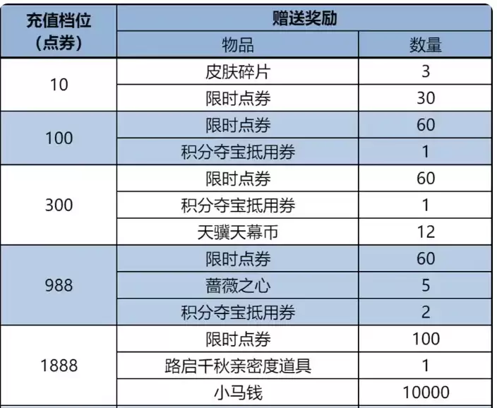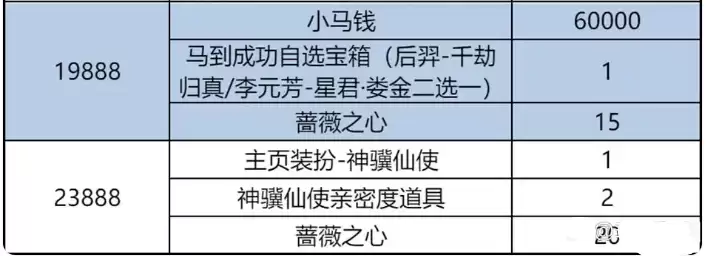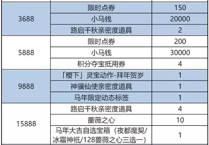 春节累计充值最高档位为23888点券,达到19888点券时即可领取累计充值限定皮肤李元芳-星君·娄金、后羿-千劫归真二选一。充值15888点券可领取曹操-夜都魔契、盘古-冰霜神祀、蔷薇之心x128三选一奖励。