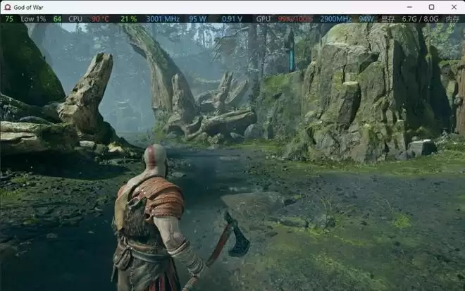 《战神4》没有基准测试程序,采用的是手动跑图测试,8060S帧速在55fps左右,RTX 4060是58fps;RTX 3060是54fps。从上面的截图大家也可以看到,双核心的总功率是95W,核显占用率基本100%,但CPU的频率较低,仅有2.1GHz——CPU频率对帧速拖了后腿。