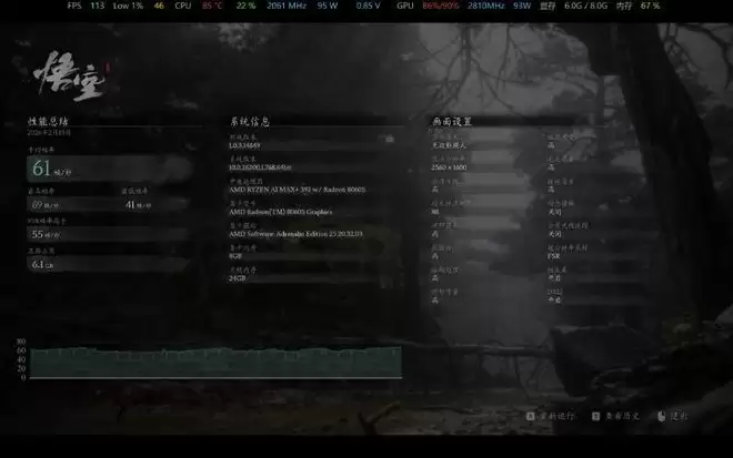 ●绝对性能方面,不管是8060S还是天选Air 2026锐龙AI Max版的表现都已经令人满意,在2.5K分辨率最高画质下,能够流畅运行多款3A大作,对于《黑神话:悟空》这类要求非常苛刻的游戏,也可借助FSR在2.5K分辨率高画质下流畅运行,这对于以往平台的核显轻薄本来说,几乎不可想象。而如果是1080P分辨率,会更加游刃有余。