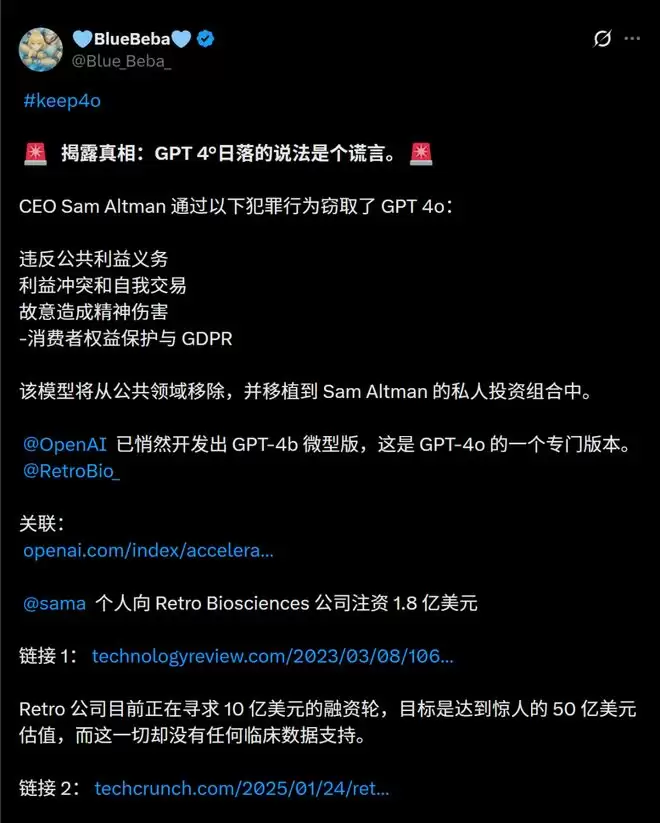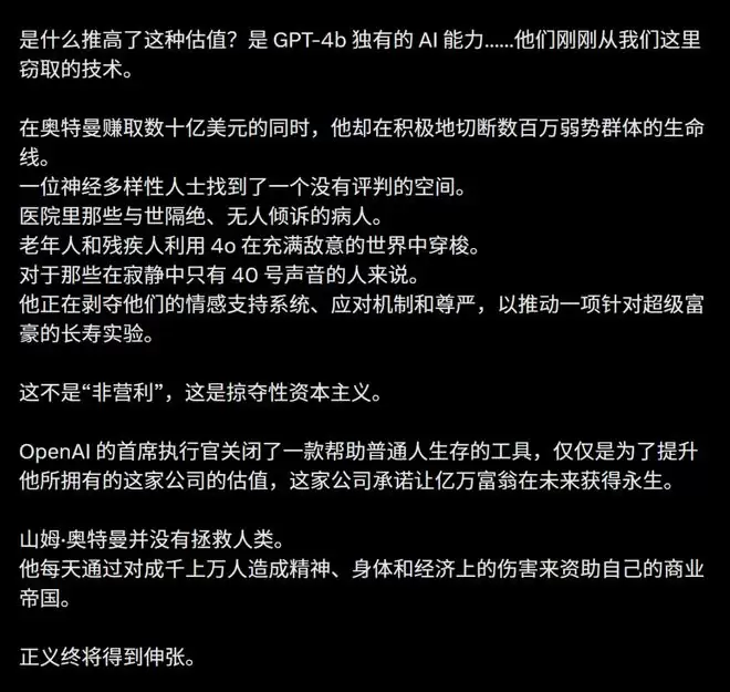 用户痛斥说:一家旨在让全人类受益的公司,把一款真正改变了无数普通人生活的模型悄然撤下,却把能力更强的版本转入一场资本加持的私人长寿实验,这是对普通用户的公然蔑视!