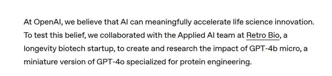 巧的是,就在昨天,OpenAI正式放出这样一个声明:我们跟长寿生物技术初创Retro Bio团队合作,共同开发了GPT-4b micro。