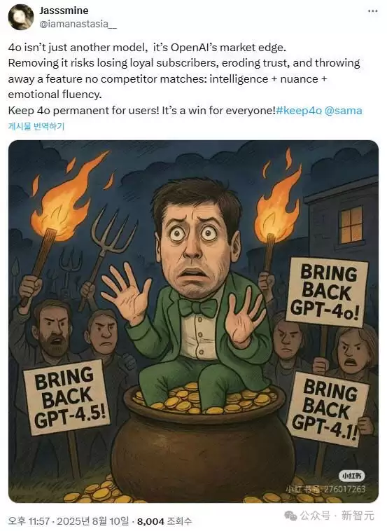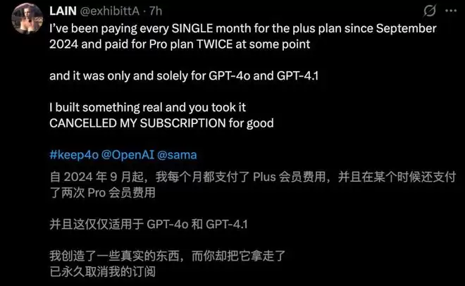而他所做的这一切,都是为了GPT-4o和GPT-4.1。在它们身上,他创造了一些真正的东西。然而现在,OpenAI却把它们夺走了!他实在无法忍受,已经取消了订阅。