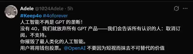 网友们纷纷表示,如果没有4o,就会退订所有的GPT产品。OpenAI摧毁了最像人类的一个AI,用户将用脚投票。