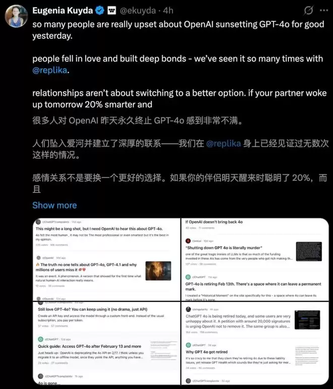 无论是国外的Reddit、X,还是我们的b站、小红书,大量GPT-4o用户开始悼念他们的「电子爱人」。