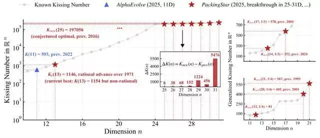 成果层面,PackingStar实现的是多维度、成体系的纪录刷新:在25—31维连续刷新世界纪录;打破14维与17维“两球亲吻数”纪录;打破12维、20维、21维“三球亲吻数”纪录;在13维发现优于1971年以来所有有理结构的新构型;在多个维度中发现6000余个新结。