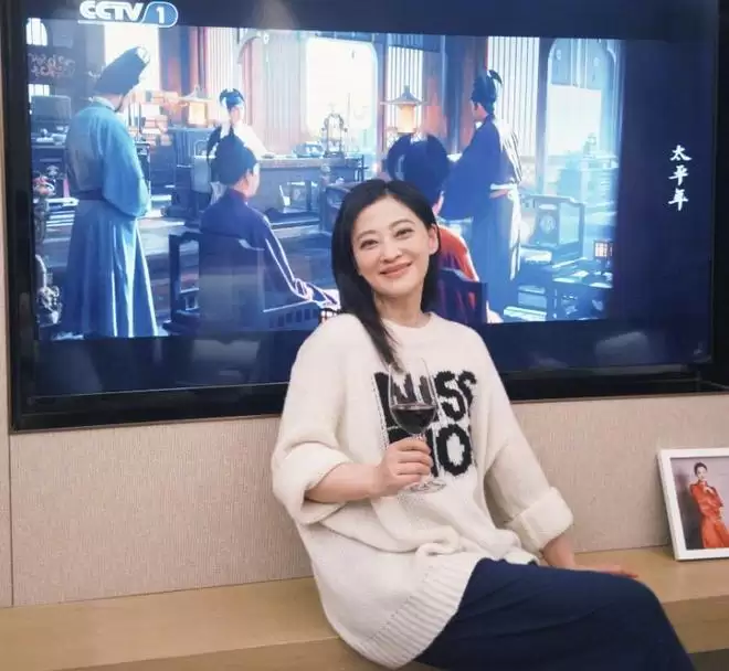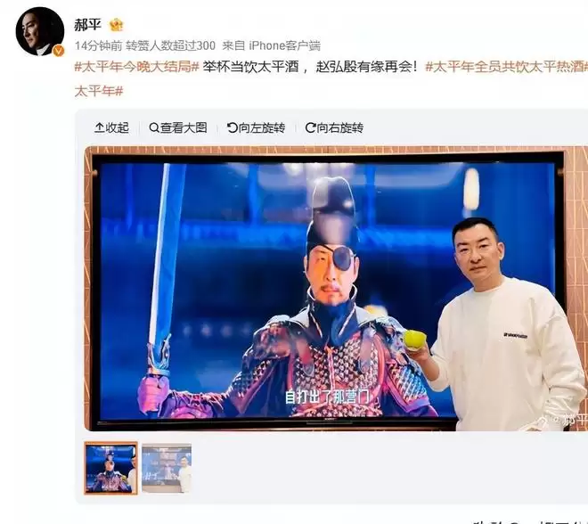 在剧中饰演了“赵弘殷”的郝平,因为是在家里,所以就能和大电视合影了。