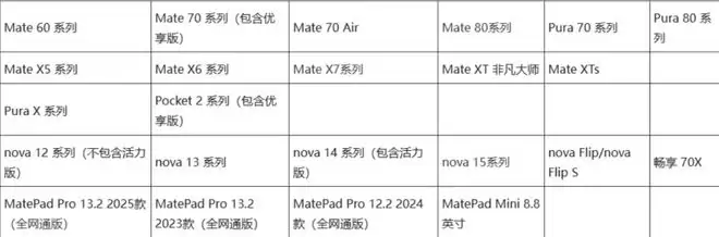 关键这次的升级名单数量还是蛮多的,第一梯队是Mate系列,从Mate 60到Mate 70、Mate 70 Air、Mate 80全系覆盖。