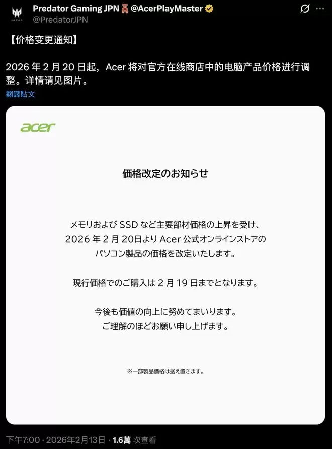 IT之家2月14日讯,宏碁日本昨日通过X平台发布公告,确认其官方线上商城将从2月20日起对电脑产品线进行价格调整。