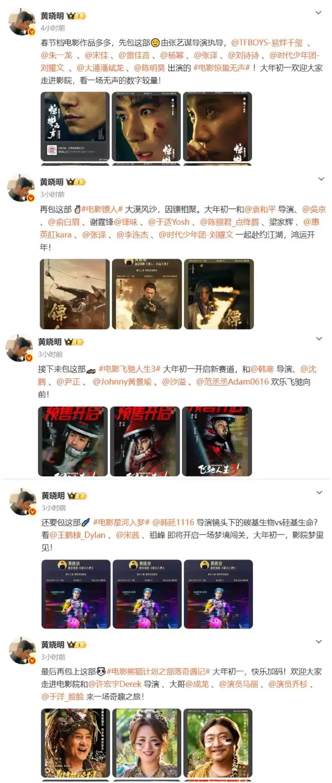 2月14日这天,演员黄晓明在社交媒体上接连发布了五条动态,分别推荐了《惊蛰无声》《镖人:风起大漠》《飞驰人生3》《星河入梦》以及《熊猫计划之部落奇遇记》这五部春节档电影的包场信息。