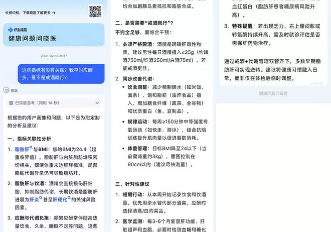 而讯飞晓医完成了从“是什么”到“为什么”再到“怎么办”的完整推理链,且具备风险分级和计划生成的能力。这是通用问答与专业健康管理之间的本质差异。值得一提的是,它还能联系本人的健康档案提供建议,这就更体现出一个长期医疗保健伙伴的价值。