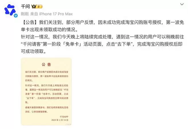 最近,有网友在社交平台反映,参与“千问请客计划”时因淘宝闪购账号授权失败,导致首波免单卡领取未能成功。2月14日,千问作出最新回应,将在今晚完成对相关情况的处理。