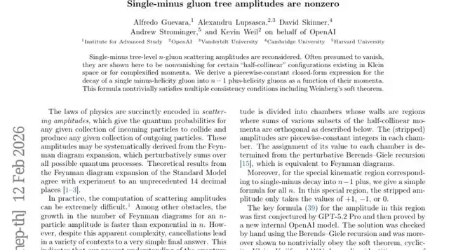 A:GPT-5.2 Pro首先"猜测"出了描述单负胶子散射的核心数学公式,这个公式极其简洁且自动满足多个重要的物理约束条件。然后由另一个OpenAI模型进行了严格的数学证明,展现了AI在处理复杂科学问题方面的巨大潜力。