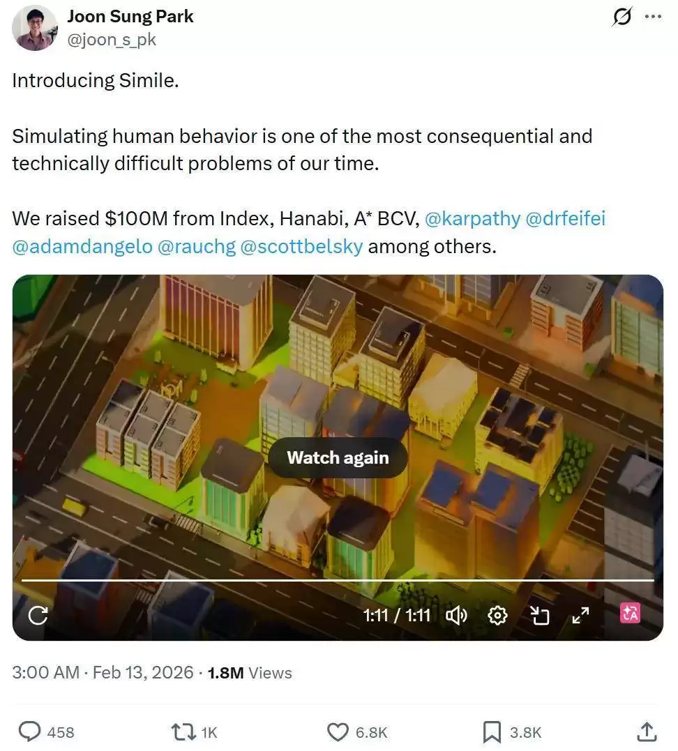 就在不久前,论文作者之一 Joon Sung Park 也在X上正式宣布了 Simile 的成立,并透露公司已完成1亿美元融资。投资人包括李飞飞、Andrej Karpathy 等多位AI领域的领军人物。