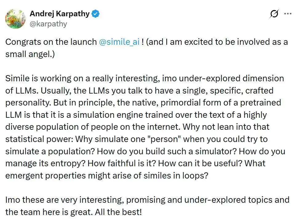 作为投资人之一的 Karpathy 表示:Simile 正在探索一个非常有趣、但仍被低估的LLM维度。通常我们与之对话的大模型,往往被赋予一个单一、精心设定的人格。但从原理上看,一个预训练LLM的原生形态,其实更像是一个基于互联网海量、多样化人类文本训练而成的模拟引擎。
