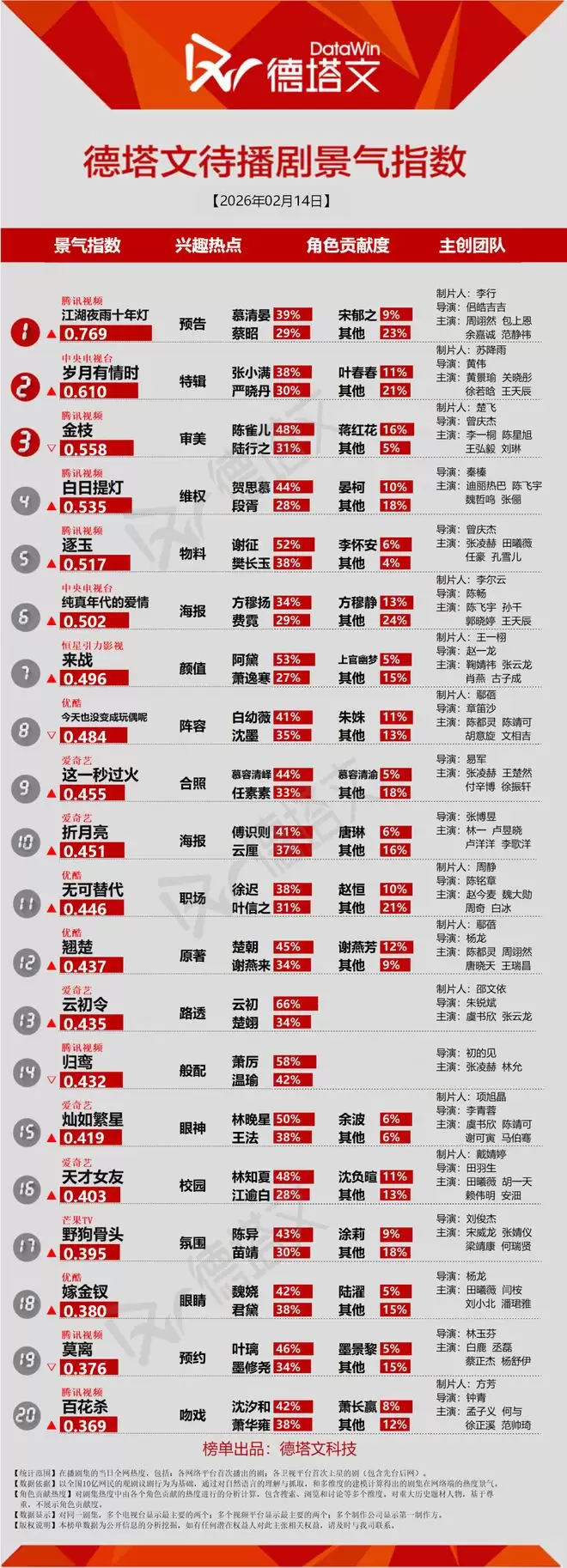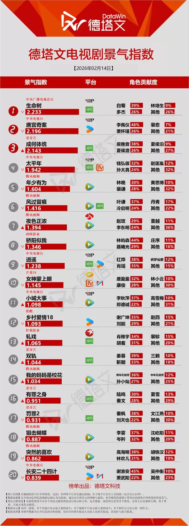 德塔文电视剧景气日报2026-02-14电视剧当日景气TOP20TOP20排名生命树(白菊39% 多杰26%) 唐宫奇案(李佩仪46% 萧怀瑾26%) 成何体统(庾晚音38% 夏侯澹2