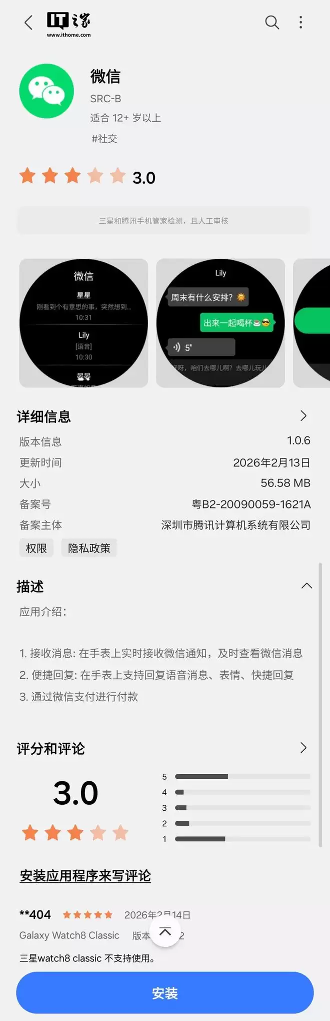 据IT之家观察,更新后Galaxy Watch8 Classic新增了独立版微信手表应用。用户可通过应用市场直接安装使用,当前版本号为1.0.6,支持消息接收、快捷回复、微信支付等核心功能。