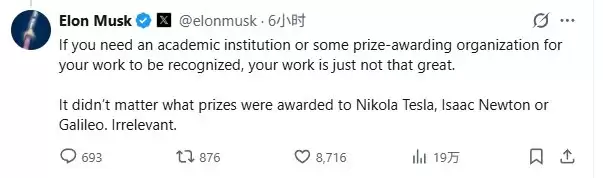 近来,马斯克回应网友对该帖子的评论时表示:“如果你的工作成果,需要学术机构或颁奖组织来认可才显得重要,那恰恰说明你做得本来就没那么出色。尼古拉·特斯拉、艾萨克·牛顿或伽利略获得过什么奖项并不重要。无关紧要。”