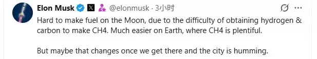 有网友提议在月球上建立永久基地,并从那里发射飞船前往火星。对此,马斯克回应道:在月球上制造燃料相当困难,因为获取氢和碳来合成甲烷(CH4)非常不易。相比之下,在地球上要容易得多,毕竟甲烷储量丰富。但也许当我们抵达月球,城市开始运转时,情况就会有所改变。