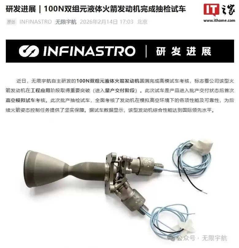 公开资料显示,北京无限宇航科技深耕商业航天在轨服务领域,已形成覆盖飞行器研发、轨道转移、多星部署、在轨延寿及空间运输的技术体系。此次发动机量产标志着我国在小型液体火箭发动机领域实现重要技术跨越,为后续星座组网、深空探测等国家重大工程提供了自主可控的动力解决方案。