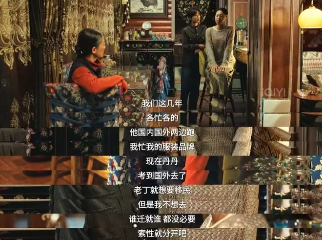 “我们这几年,各忙各的,他国内国外两边跑,我忙我的服装品牌,现在女儿考到国外去了,老丁就想移民,我不想去,这种事,谁迁就谁,都没必要,索性就分开。”