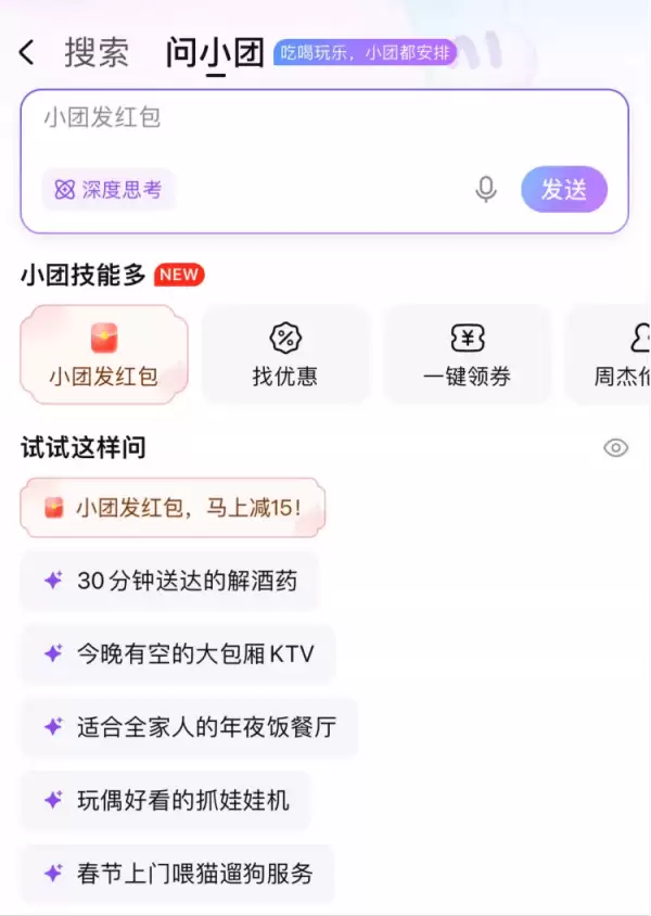 2月12日,美团升级了“问小团”AI管家功能。从即日起至整个春节假期,用户只需在美团App中使用该工具,提出与本地吃喝玩乐相关的问题,“问小团”就能迅速进行深度思考,整合美团平台上准确及时的商户与服务信息,并经过二次校验,结合真实用户评价,为您精准匹配需求并提供可直接下单的选择。