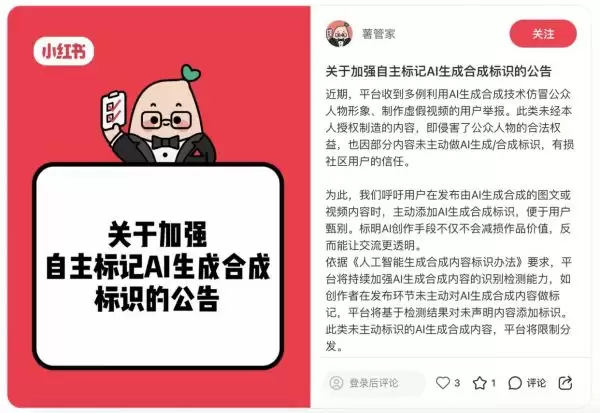 小红书新规:AI生成内容需主动标识,未标识将限制推荐
