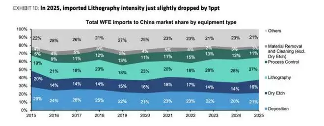 光刻机进口方面,2025年全年进口额与2024年基本持平,仅同比下滑1%,但12月光刻机进口额达23亿美元,创下月度历史纪录。(相关进口指标包括:沉积、干法刻蚀、光刻机、过程控制系统、材料去除与清洁、其他,以及对应总额和不含光刻的总额)
