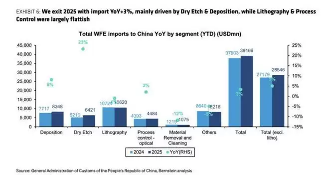伯恩斯坦根据中国海关公开数据,对2025年中国半导体晶圆制造设备(WFE)进口情况进行了回溯分析。结果显示,2025年中国晶圆制造设备进口总额达391.66亿美元,同比增长3%,创下历史新高;其中12月单月进口额45.08亿美元,环比增长84%,成为全年进口峰值。