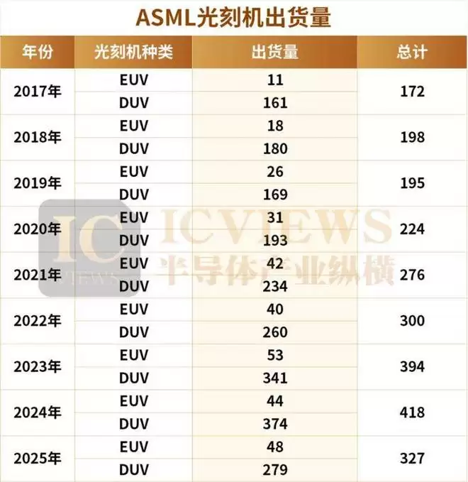 回顾过往,2016年及以前,ASML的EUV光刻机年出货量仅1-5台,DUV光刻机年出货量约150台;2017年后,EUV出货量逐年攀升,2024年达到峰值53台,同期DUV出货341台;2024年,ASML光刻机总出货量创下历史最高,为418台。