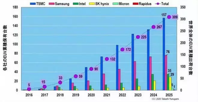 自 ASML 在 2016 年正式量产 EUV 光刻机以来,这十年间全球累计交付的 EUV 设备约为 309 台。其中,台积电独占 157 台,占比高达50.8%—— 全球一半的 EUV 产能都被这家中国台湾代工厂收入囊中。紧随其后的是三星,其工厂内部署了 76 台 EUV;Intel 则拥有 35 台,SK 海力士 29 台,美光 5 台,而 2024 年才成立的日本 Rapidus 公司,也拿到了 1 台 EUV 作为先进制程布局的起点。