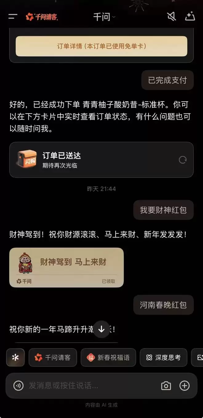自2月6日起,千问推出春节免单活动后,2月14日千问突然宣布免单再加3天,接入大麦、飞猪,邀请全国人民体验AI买电影票、门票等新功能,激活春节AI新消费。2月15日,千问C端事业群总裁吴嘉首度回应千