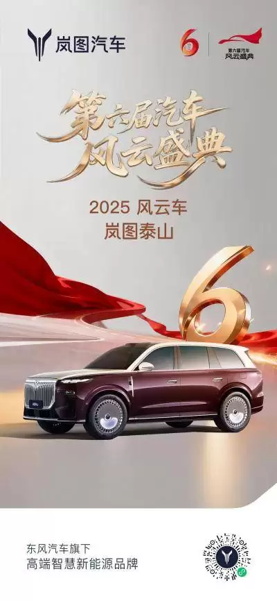 在第六届《汽车风云盛典》的璀璨舞台上,岚图汽车旗下新时代旗舰大六座SUV岚图泰山成为全场瞩目的焦点。这款车型凭借全方位的硬核产品力与行业突破性技术,一举斩获“2025风云车”殊荣,其搭载的岚海智能超混技术也获评“年度创新案例”,展现了国产豪华汽车品牌的强劲实力。