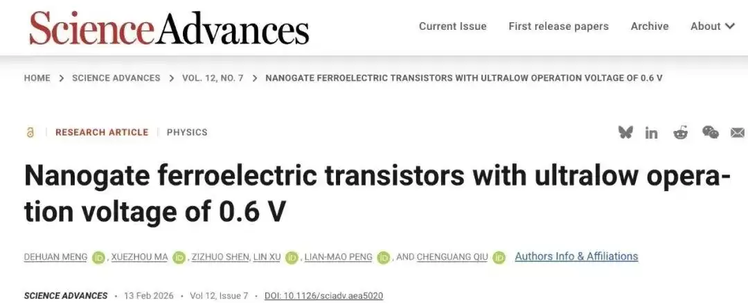 据IT之家2月16日报道,北京大学最新研究团队在非易失性存储器领域取得突破性进展。该校电子学院邱晨光与彭练矛教授团队首次提出"纳米栅超低功耗铁电晶体管"概念,成功实现了超低功耗下的高效数据存储,相关研究成果已于近日发表于《科学·进展》期刊。