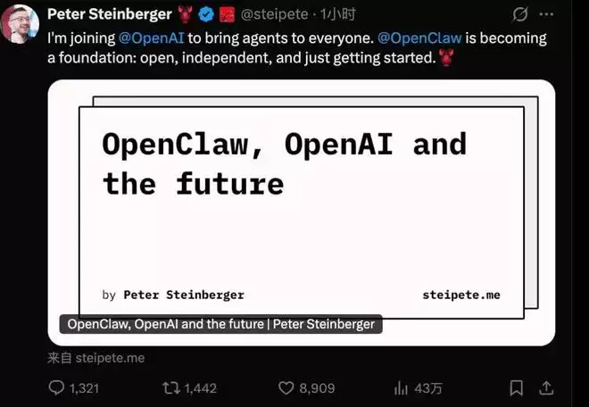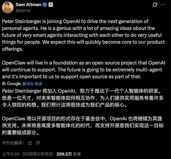 OpenAI 的 Sam Altman 也在社交媒体 X 上发文确认,Peter Steinberger 加入后,将致力于打造下一代个人智能助手。