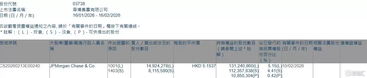 根据联交所最新披露的权益资料显示,2月16日,阜博集团(03738.HK)获得JPMorgan Chase & Co.以每股均价5.1537港元增持好仓1492.43万股,涉及资金约7691.53万港元。