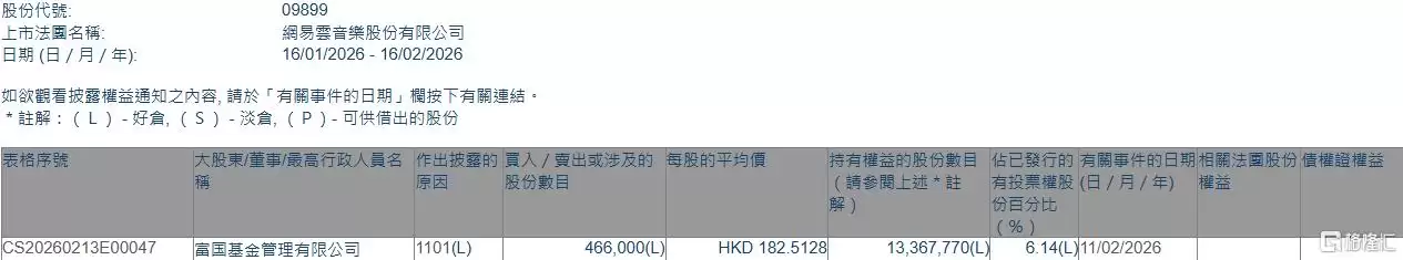 根据联交所最新披露的权益资料显示,2月16日,网易云音乐(09899.HK)获得富国基金管理有限公司在场内以每股均价182.5128港元增持46.6万股,涉及资金约8505.1万港元。