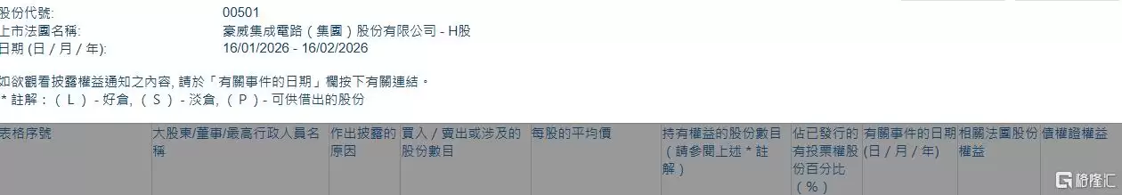 根据联交所最新权益披露资料,截至2026年2月10日,豪威集团(00501.HK)获JPMorgan Chase & Co.以每股均价106.0806港元增持好仓7.9万股,涉及资金约838.04万港元。