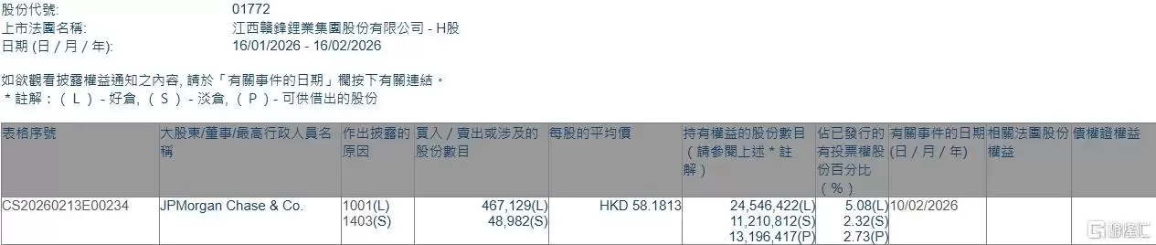 根据联交所最新披露的权益资料,2026年2月10日,赣锋锂业(01772.HK)获得JPMorgan Chase & Co.以每股均价58.1813港元增持约46.71万股,涉及资金约2717.82万港元。