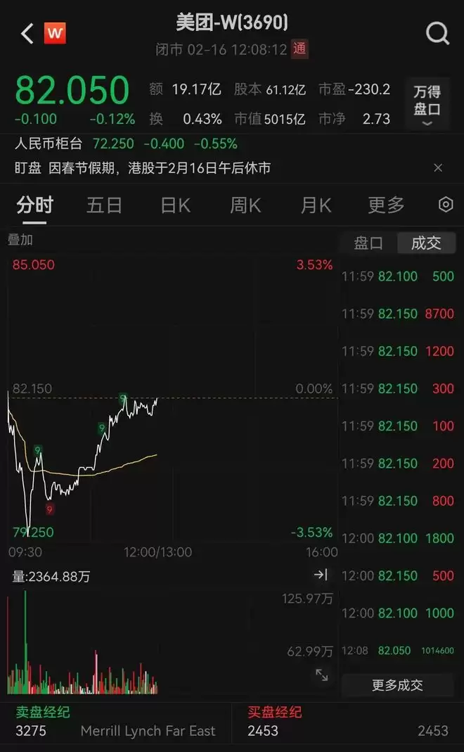 2月16日当天,美团港股股价走弱,盘中一度跌破80港元关口。截至收盘,美团股价报82.05港元,单日跌幅为0.12%。公司此前发布公告称,预计2025年将录得净亏损约233亿元至243亿元人民币。