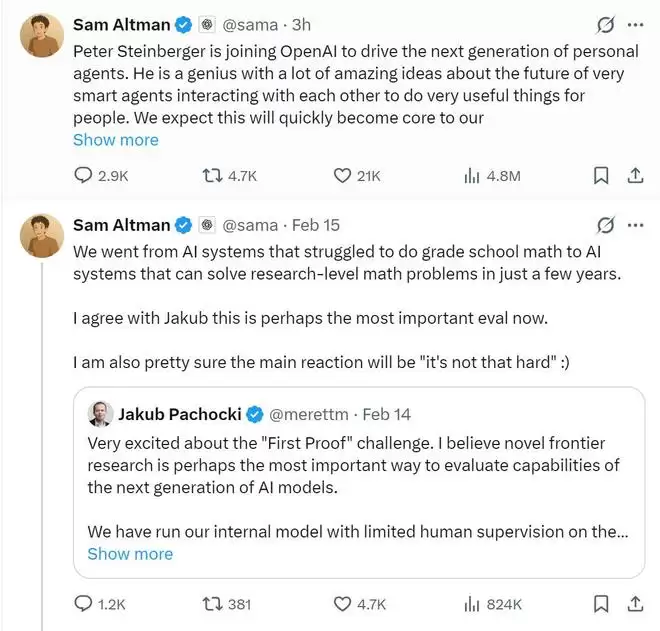 阿尔特曼透露,OpenClaw将以开源项目的形式存在于基金会架构中,并持续获得OpenAI的技术支持。“未来必将迎来多元智能体协同发展的新时代,对我们而言,支持开源生态将是其中至关重要的环节。”他补充道,“在短短数年间,我们的人工智能系统已实现跨越式发展——从最初难以解答基础数学题目,到如今能够应对研究级别的复杂数学问题。”